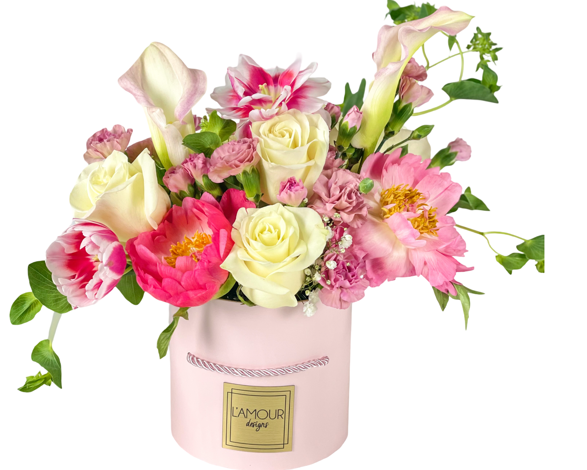Blushing Elegance Hatbox is a refined, romantic floral arrangement designed to make a soft yet unforgettable statement. Styled in L’amour Floral Designs’ signature blush hatbox, this arrangement features lush layers of creamy white roses, pink peonies, elegant calla lilies, and delicate accent blooms. The design is airy, graceful, and feminine, blending classic luxury with modern garden charm. It is ideal for meaningful celebrations, heartfelt gestures, and elevated everyday gifting.