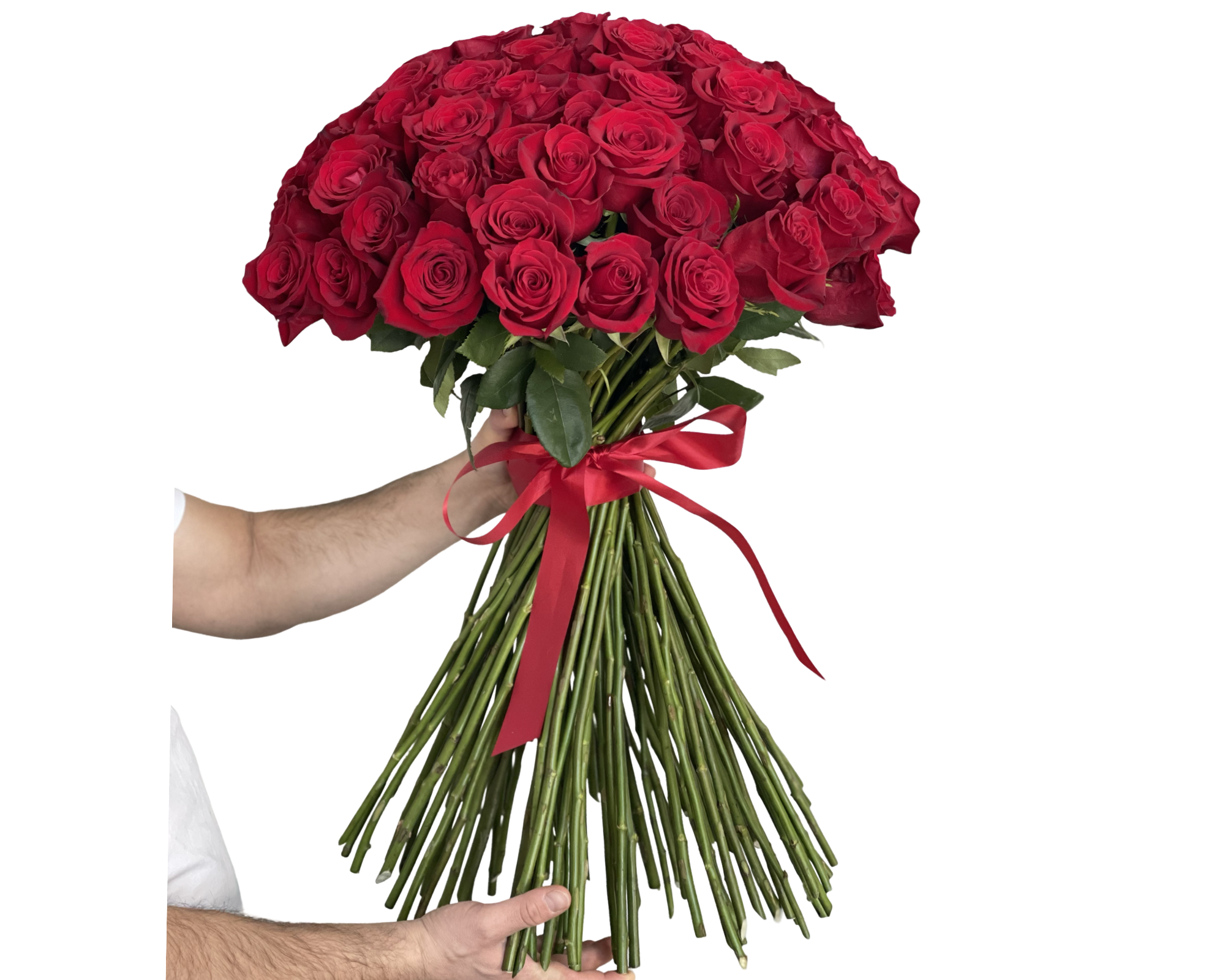 Premium long-stem red roses, fresh green foliage, satin ribbon tie