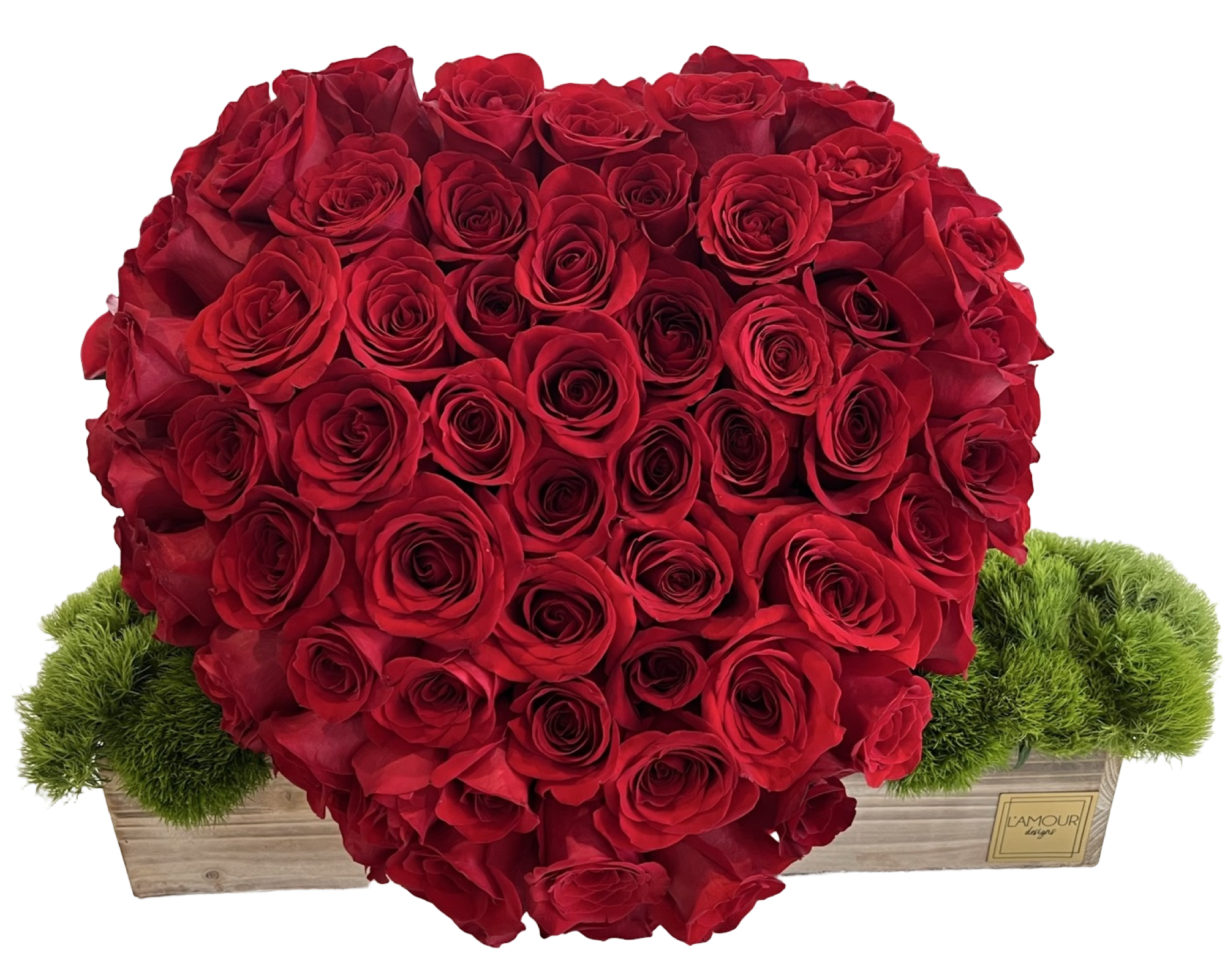 Premium red roses, natural green moss accents