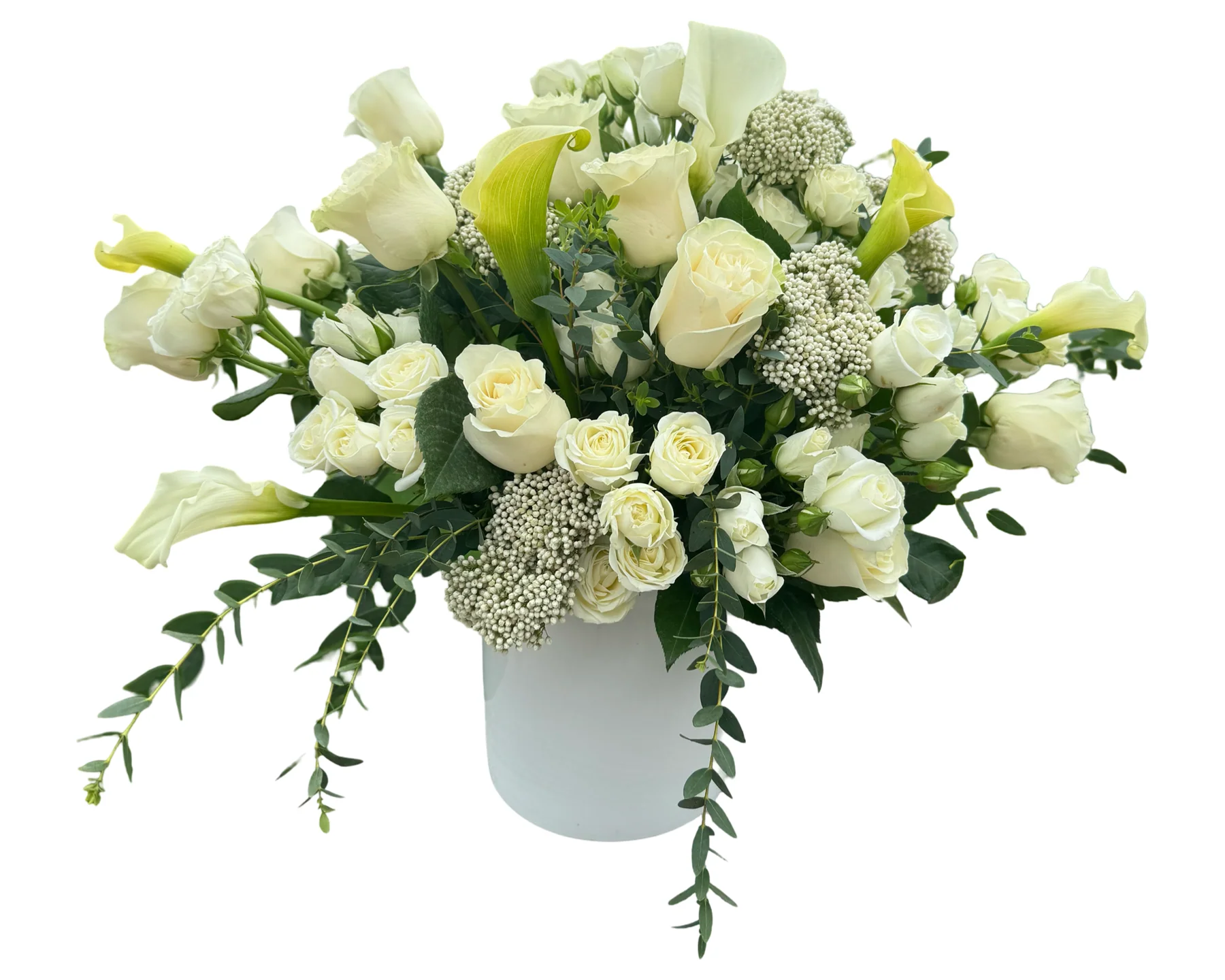 Ivory Grace is a serene and elegant floral statement, designed with purity and sophistication in mind. Featuring a graceful mix of white roses, creamy spray roses, calla lilies, and delicate snowberry-like accents, this arrangement is elevated by lush greenery and sculptural trailing stems. Set in a clean white ceramic cylinder vase, Ivory Grace is ideal for conveying heartfelt sentiments, honoring loved ones, or creating a calming, upscale ambiance in any setting. It’s the perfect blend of minimalism and texture for timeless beauty and gentle strength.