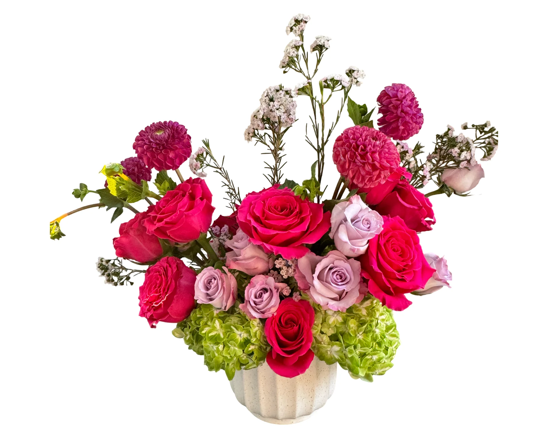 Love Struck is a charming floral arrangement full of vivid personality and graceful elegance. Designed in a soft white ceramic vase with gentle vertical ridges, this piece showcases a vibrant mix of magenta roses, lavender roses, bright green hydrangeas, raspberry dahlias, and delicate white filler flowers. The rich color contrast between the berry tones and fresh green base adds depth and dimension, making this a cheerful yet refined choice for expressing joy, admiration, and love. Perfect for meaningful occasions or simply to brighten someone’s day, Love Struck blends modern chic with timeless sentiment.