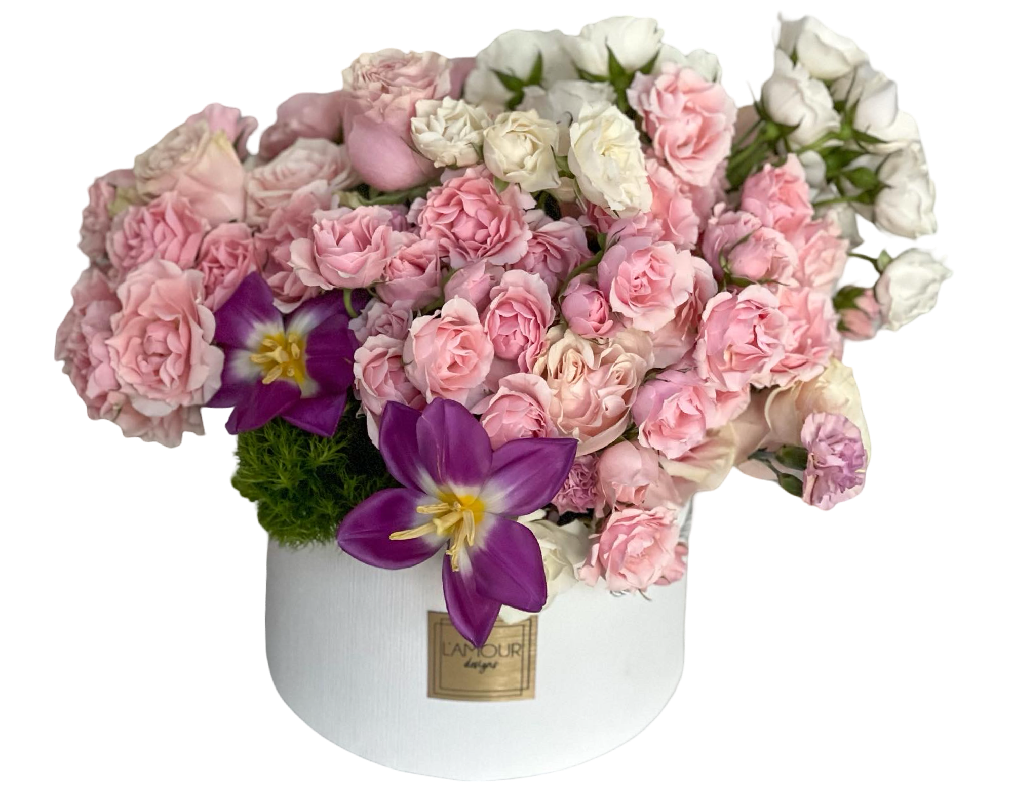Pink Rose Cloud is a lush, romantic floral arrangement designed to feel soft, full, and irresistibly charming. Layers of delicate blush and soft pink spray roses create a cloud-like composition, accented with creamy white blooms and vibrant purple tulips for contrast and depth. This arrangement feels joyful yet elegant, making it a beautiful statement piece that instantly brightens any space.